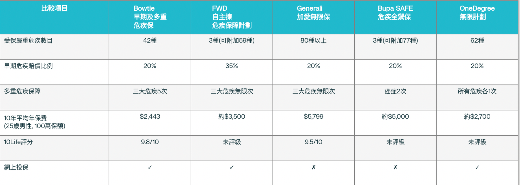 | Bowtie | 保費最低、10Life 最高評分、多重保障 5 次、「額外賠償」機制、純網上投保 | 危疾數目較少(42 種)、核保嚴格、無 Agent 支援 |