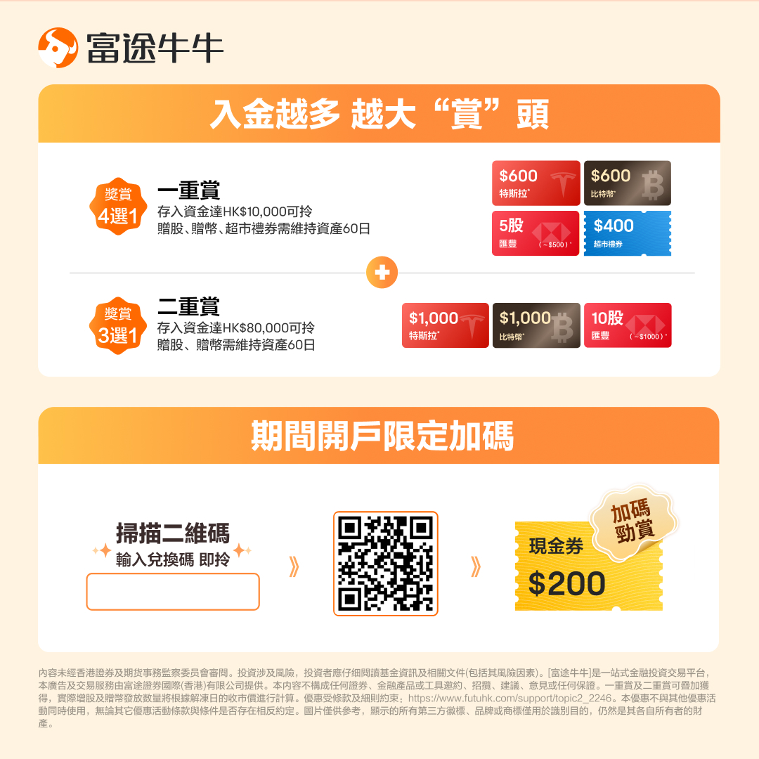 [富途牛牛]是一站式金融投資交易平台,本廣告及交易服務由富途證券國際(香港)有限公司提供。本內容不構成任何證券、金融產品或工具邀約、招攬、建議、意見或任何保證。一重賞及二重賞可疊加獲得,實際贈股及贈幣發放數量將根據解凍日的收市價進行計算,5%開戶賞適用於富途平台上的所有基金(非私募基金),富途僅向特定客戶群體提供虛擬資產及相關產品的交易服務,包括並非來自禁止進行虛擬資產交易的司法管轄區,並具備較高風險承受能力的客戶,具體以APP頁面顯示及審核結果為準。優惠受條款及細則約束:https://www.futuhk.com/support/topic2_2246。本優惠不與其他優惠活動同時使用,無論其它優惠活動條款與條件是否存在相反約定。圖片僅供參考,顯示的所有第三方徽標、品牌或商標僅用於識別目的,仍然是其各自所有者的財產。